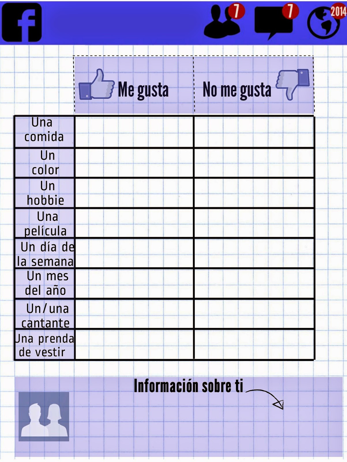 Para muestra, un botón: el primer día. Si rebuscamos en libros y webs sobre clases de ELE o cualquier otra lengua, o mismamente indagamos en nuestra experiencia en busca del recuerdo del primer día que asistimos a un curso de idiomas, encontramos actividades con el mismo nexo en común: hablar de nosotros mismos, presentarnos a los demás. Para tal cometido confeccioné unas fichas en la línea de la entrada que publiqué hace unas semanas, inspiradas en un muro de Facebook (ninguno de mis quince púberes alumnos me confesó no estar registrado en el invento de Mark Zuckerberg) que resultaron gozar de bastante éxito.