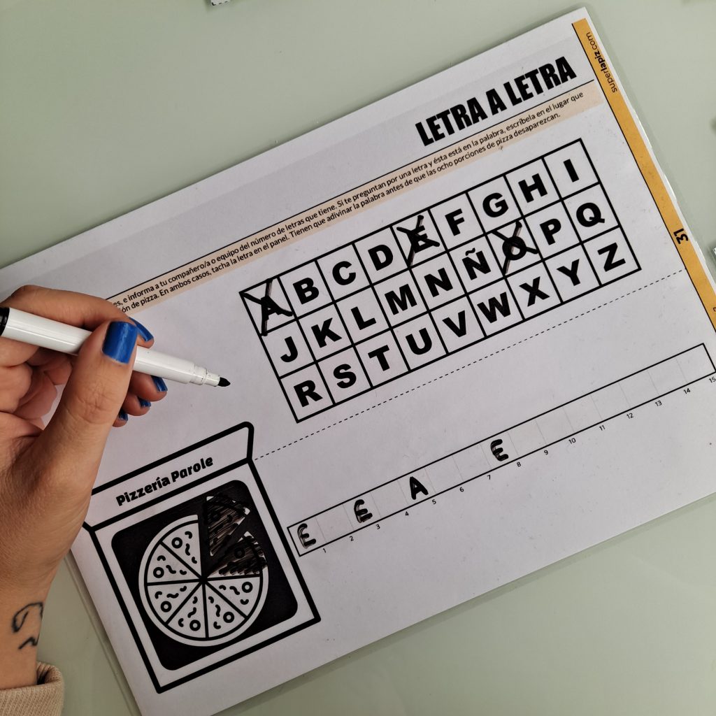 El ahorcado ahora es una pizzería… premium. Piensa una palabra, sin decir cuál es, e informa a tu compañero/a o equipo del número de letras que tiene. Si te preguntan por una letra y ésta está en la palabra, escríbela en el lugar que ocupa. Si no está, colorea una porción de pizza. En ambos casos, tacha la letra en el panel. Tienen que adivinar la palabra antes de que las ocho porciones de pizza desaparezcan.