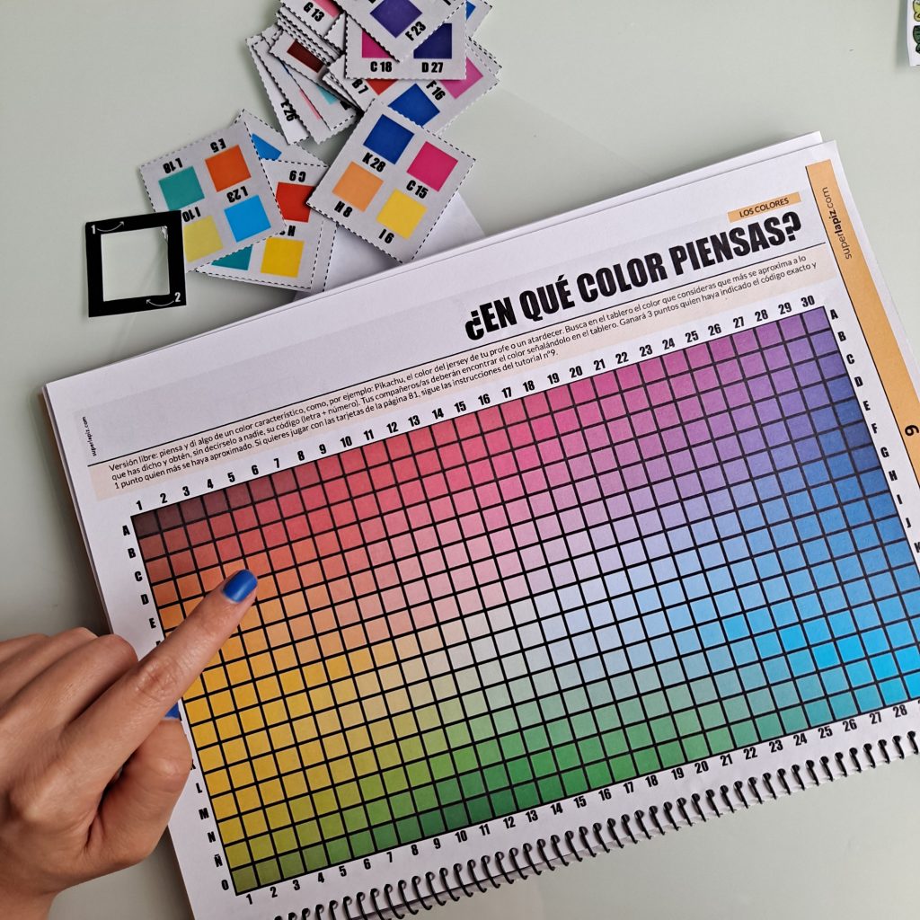Versión libre: piensa y di algo de un color característico, como, por ejemplo: Pikachu, el color del jersey de tu profe o un atardecer. Busca en el tablero el color que consideras que más se aproxima a él que has dicho y obtén, sin decírselo a nadie, su código (letra + número). Tus compañeros/as deberán encontrar el color señalándolo en el tablero. Ganará 3 puntos quien haya indicado el código exacto y 1 punto quien más se haya aproximado. Si quieres jugar con las tarjetas de la página 81, sigue las instrucciones de este tutorial.